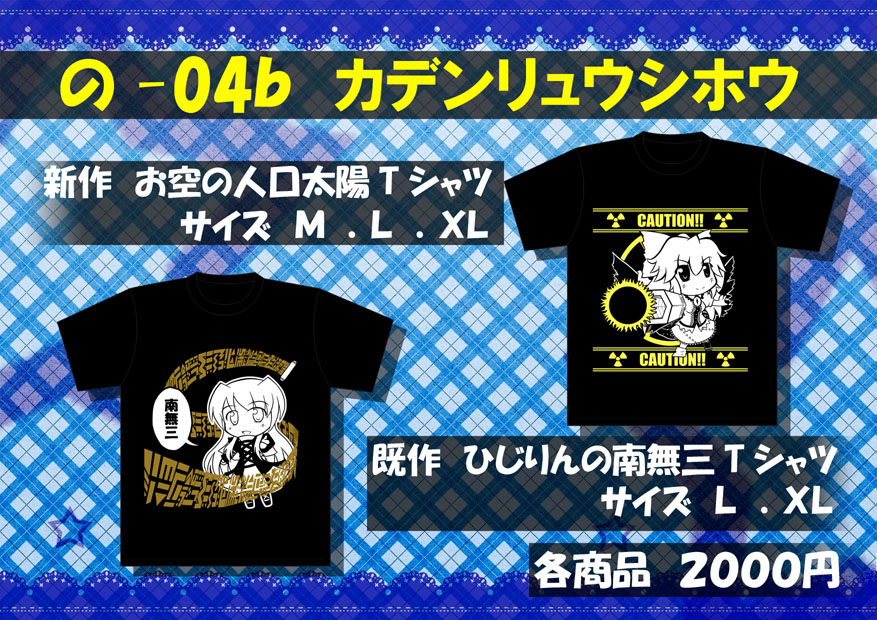 今回の新作は、お空の人工太陽Tシャツ(仮)とひじりんの南無三Tシャツの再販をする予定です!